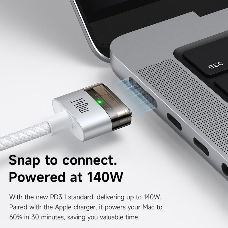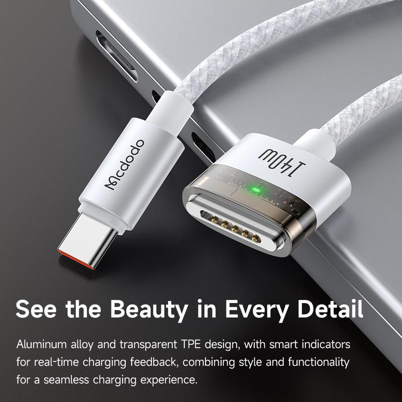 Carregue os seus dispositivos de forma mais rápida e inteligente com o MCDODO CA-207. Com suporte de fornecimento de energia de 140W, este cabo foi concebido para fornecer um carregamento estável e eficiente aos seus dispositivos Apple, incluindo MacBooks e iPhones, com a conveniência adicional de alinhamento magnético para uma ligação instantânea.