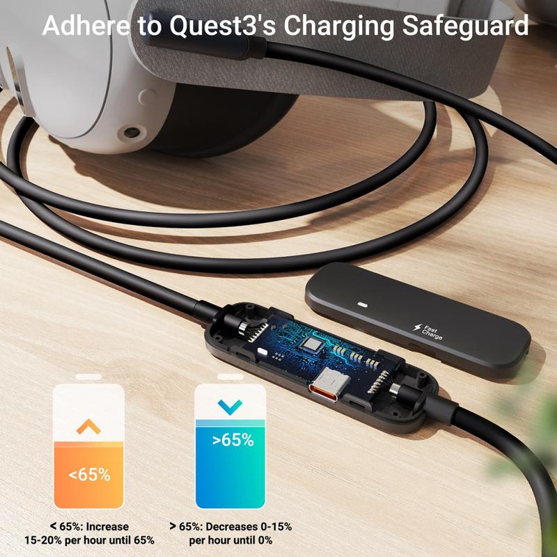 Concebido para movimentos ativos, o comprimento do cabo dá-lhe mais liberdade em jogos à escala da sala, e uma tira de velcro ajuda a manter o cabo organizado e a reduzir puxões acidentais. Um chip de segurança atualizado foi concebido para acompanhar o comportamento de carregamento do Quest, reduzindo a potência de carregamento quando o nível da bateria está acima de 65%, ajudando a manter a saúde da bateria. A capa de PVC mais espessa e flexível foi concebida para suportar dobras frequentes e jogos de alta mobilidade.