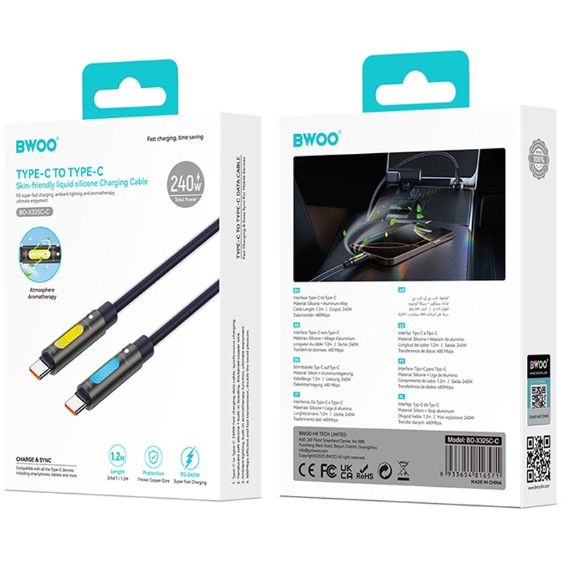 Cabo de carregamento BWOO USB-C para USB-C para aromaterapia 240 W 1,2 m - Luz RGB, silicone líquido, 480 Mbps
