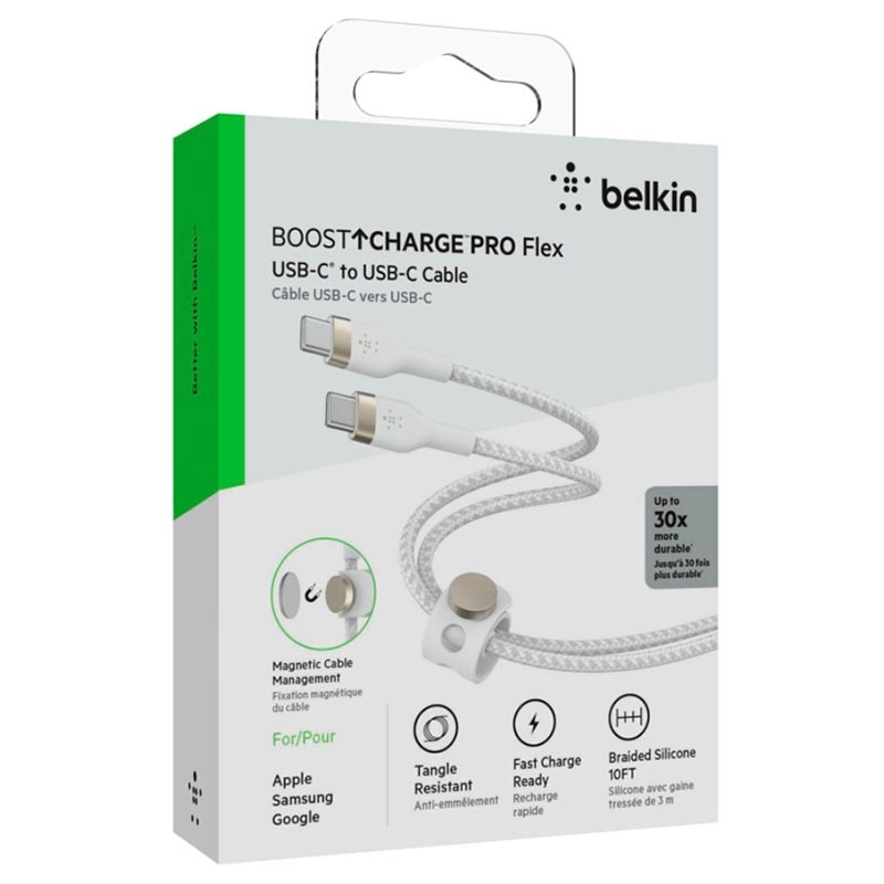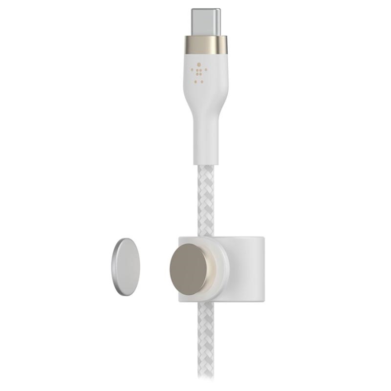 O Belkin BoostCharge Pro Flex é um cabo ultra-flexível e ultra-duradouro conveniente para carregar todos os seus dispositivos habilitados para USB tipo C. Suporta o protocolo de carga rápida Power Delivery com saída máxima de 60W para um carregamento super-rápido. Este cabo de silicone tem um revestimento em nylon trançado e um encapsulamento em alumínio reforçado ao redor dos conectores, pelo que se mantém livre de emaranhados e resistente ao desgaste. Além disso, vem com uma cinta de cabo magnético que lhe permite anexar ou armazenar este cabo de carregamento em qualquer lugar de forma rápida e simples.