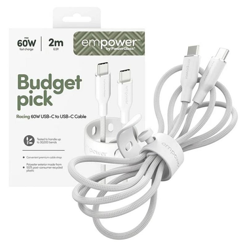 O cabo USB-C para USB-C empower by PanzerGlass Racing combina velocidade, conforto e durabilidade num único cabo. O seu toque ultra suave torna-o agradável de usar todos os dias, enquanto o design trançado reforçado garante que ele resiste ao uso intenso. Com carregamento rápido de 60W e materiais sustentáveis, é uma escolha confiável que pode usar com tranquilidade.