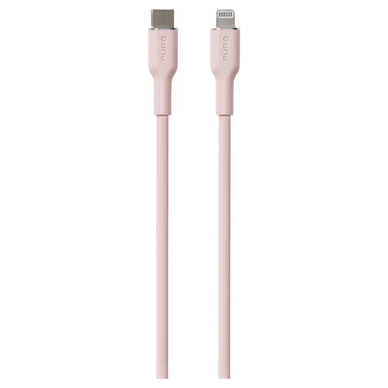 Cabo macio com conetor USB-C e Lightning feito de silicone de toque suave em cor-de-rosa suave.