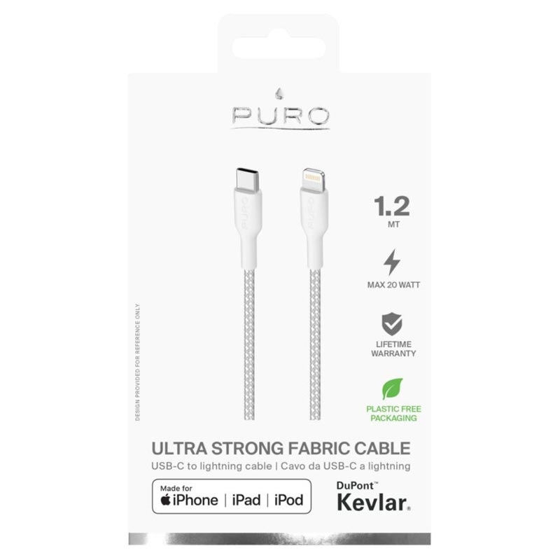Cabo de carregamento e sincronização Puro com 1,2 metros de comprimento USB-C para Lightning e fabricado em material ultra-resistente, como o tecido Kevlar.