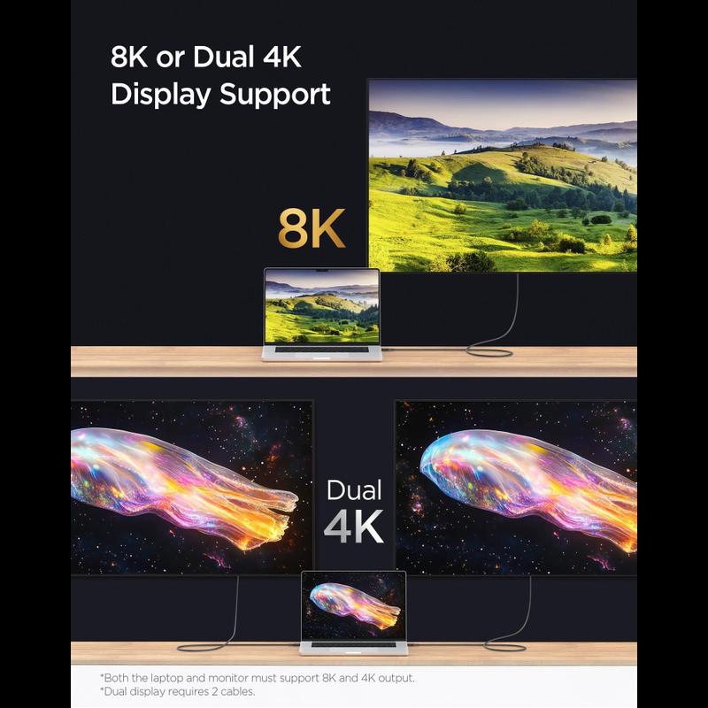 Graças à compatibilidade com Thunderbolt 3 e 4, o cabo também suporta saída de vídeo avançada - 8K (ecrã único) e 4K (ecrãs duplos) via DisplayPort 2.0. Isto torna-o perfeito para ligar computadores portáteis ou estações de ancoragem a monitores de alta resolução.