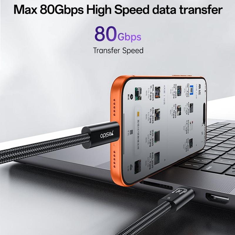 Com suporte para uma velocidade de transmissão de até 80 Gbps, o Yesido CA211 é adequado para a transferência rápida de ficheiros, cópias de segurança de dados e sincronização eficiente de ficheiros de grande dimensão. Também suporta carregamento de até 240W, ajudando os dispositivos compatíveis a carregar com alta potência quando emparelhado com um carregador adequado e hardware compatível. Para utilização em ecrãs, o cabo suporta transmissão de vídeo até 16K a 60 Hz, tornando-o uma excelente opção para configurações visuais avançadas e ecrãs externos de alta resolução.