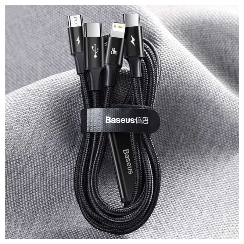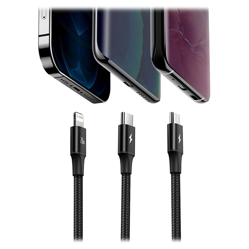 Cabo USB Tipo-C 3 em 1 Baseus Rapid CAMLT-SC01 - Lightning, USB-C, MicroUSB, PD 20W, 3A, 2A - 1.5m