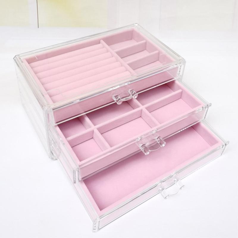 - A tampa em acrílico transparente facilita a visualização e a seleção rápida das jóias sem abrir a caixa