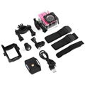 A câmara de desporto SJ vem com bolsa impermeável, suporte para bolsa impermeável, clipe para bolsa impermeável, suporte de bicicleta, clipe para câmara, base fixa, uma tira de velcro, um cabo microUSB e um manual do usuário.