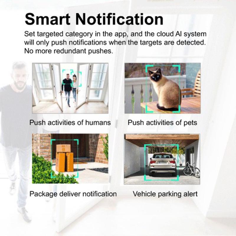 - Alertas inteligentes de IA. O reconhecimento de pessoas, animais de estimação, carros, pacotes e uma zona de vedação ajustável mantêm as notificações relevantes.
