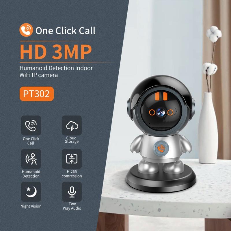 Uma torre de vigilância rotativa, um intercomunicador e uma sirene de alarme cabem todos numa concha do tamanho da palma da mão. O PT302 oferece vídeo 1296P nítido, chamadas telefónicas instantâneas a partir do botão da câmara e um controlo de inclinação panorâmica que abrange quase toda a sala.
