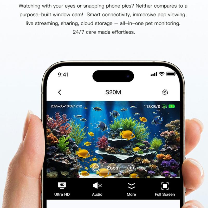 A câmara de aquário S20M é uma câmara de segurança Full HD compacta concebida para uma monitorização clara e contínua de aquários, terrários, animais de estimação e espaços interiores. Com uma resolução de 1080p e um ângulo de visualização alargado, proporciona imagens nítidas e detalhadas de dia e de noite. A discreta visão nocturna por infravermelhos de 940 nm permite uma monitorização oculta sem perturbar os peixes, tornando-a ideal para ambientes sensíveis.