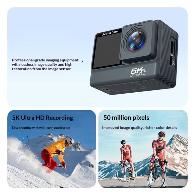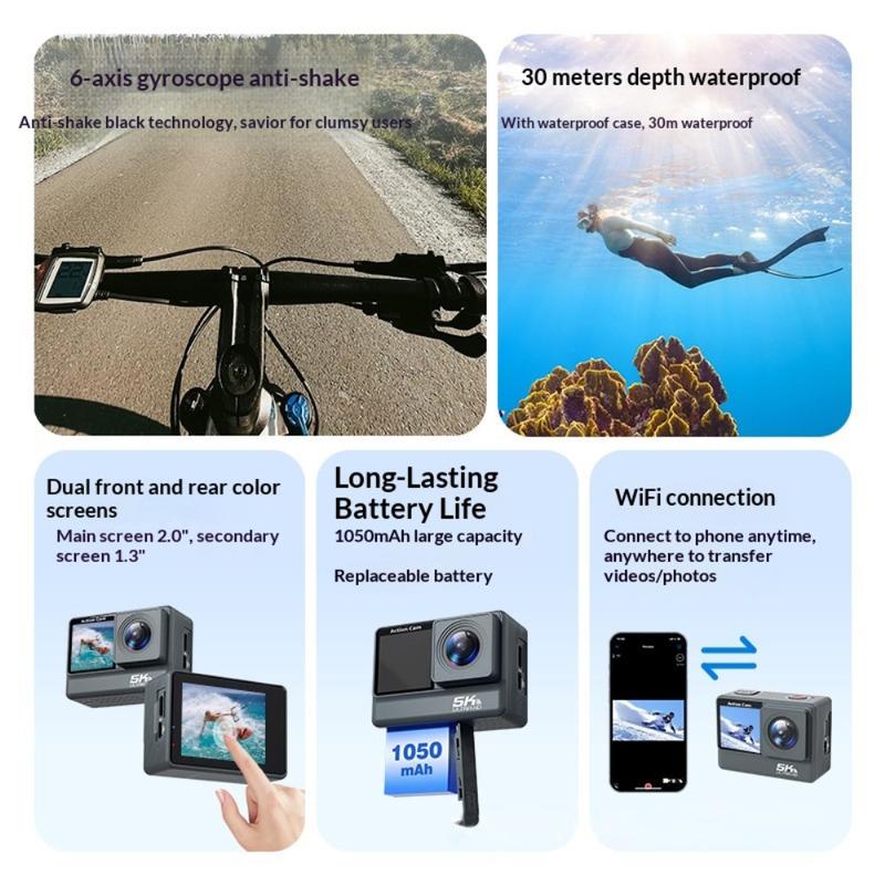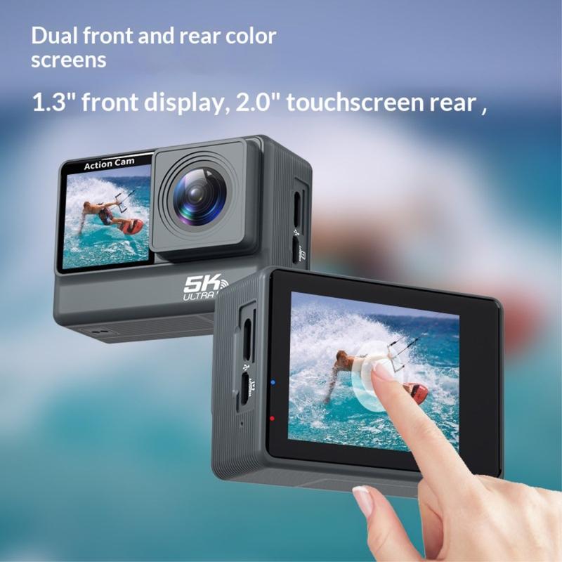 Câmara de ação com ecrã duplo F308AATR - Câmara desportiva 5K HD com estabilização de 6 eixos, WiFi e caixa à prova de água