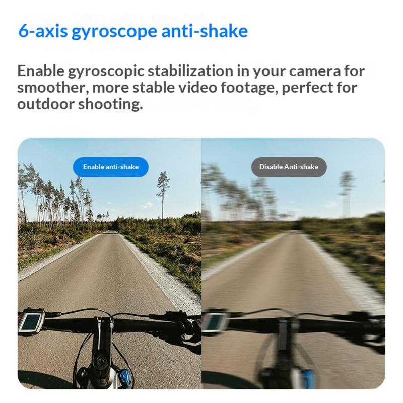 A estabilização giroscópica avançada de 6 eixos mantém os vídeos suaves e estáveis, mesmo durante desportos de alta velocidade, ciclismo ou terrenos acidentados, para que as suas filmagens tenham um aspeto profissional sem equipamento adicional.