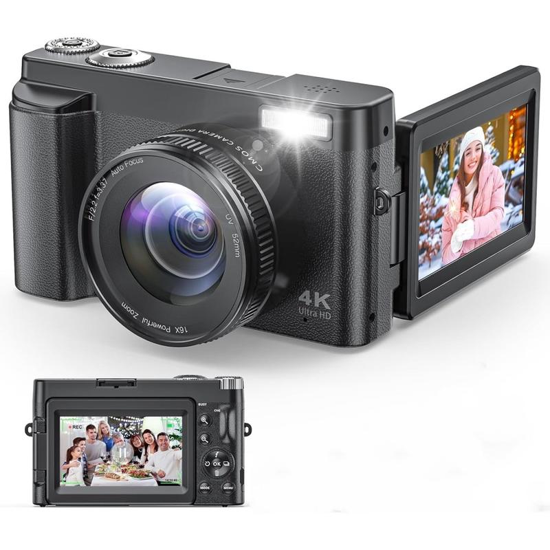 CD01 Câmara digital 4K com ecrã articulado de 3,0 polegadas - Câmara para fotografia e vlogging com zoom de 16X e cartão de memória de 64GB
