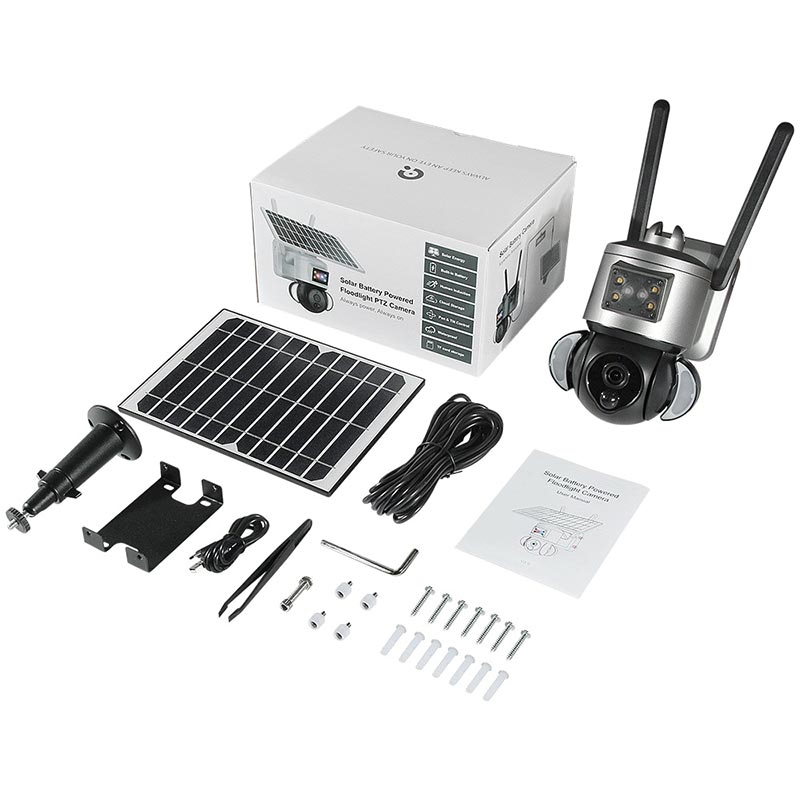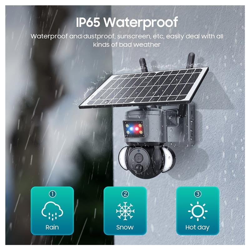 A câmera S528 PTZ possui um painel solar de 6 W que fornece ampla potência para operação contínua. Com sua conectividade Wi-Fi, você pode monitorar convenientemente sua casa a partir de seu smartphone. Esta câmera de segurança também é equipada com recursos de visão noturna, um sensor de detecção de movimento PIR e um sistema de áudio bidirecional. A função PTZ permite que a câmera gire horizontalmente, verticalmente e amplie detalhes específicos com precisão. Além disso, a câmera de vigilância S528 PTZ possui uma classificação de resistência à água IP65, tornando-a adequada para montagem externa.