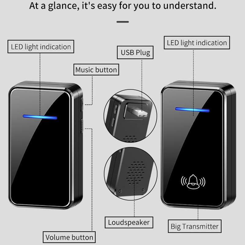 Campainha sem fios USB A80 - 150 m de alcance, 60 melodias e 5 níveis de volume para campainha de porta (1 emissor + 2 receptores)