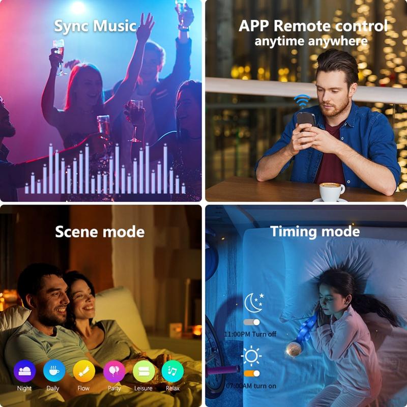 Controlo por aplicação móvel: Controle várias luzes através de uma aplicação para smartphone. O controlo de grupo está disponível (dispositivos ligados por WiFi como um grupo, dispositivos ligados por Bluetooth como outro), sem limite do número de dispositivos num grupo WiFi e até 5 (Android) ou 6 (iOS) dispositivos num grupo Bluetooth