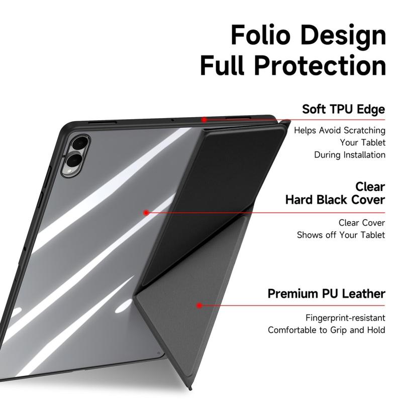 Ultra-fino: O exterior frontal fino, leve e suave ao toque é feito de couro PU de primeira qualidade, o interior sem riscos oferece uma excelente proteção e a estrutura em TPU + parte posterior em PC torna o seu tablet mais estável
