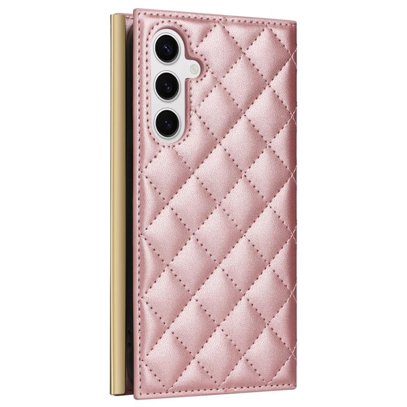 Proteja o seu Samsung Galaxy S24 com esta luxuosa capa de carteira acolchoada. Construída com material TPU revestido com couro PU, esta capa é resistente a riscos e anti-impressão digital, mantendo o seu telemóvel com estilo e elegância. A linha de costura forma um padrão de grelha em losango, dando um toque elegante e bonito à capa. A borda elevada da câmara e do ecrã oferece uma proteção eficaz contra riscos, enquanto os recortes precisos permitem o acesso total a todos os botões, portas e outras funcionalidades. O design em forma de carteira permite guardar facilmente cartões e dinheiro essenciais, e as ventosas incluídas podem ser utilizadas como suporte para uma utilização mãos-livres. Com proteção adicional contra riscos, impactos, quedas e danos diários, esta capa também inclui uma correia de ombro e uma correia de pulso para maior comodidade.