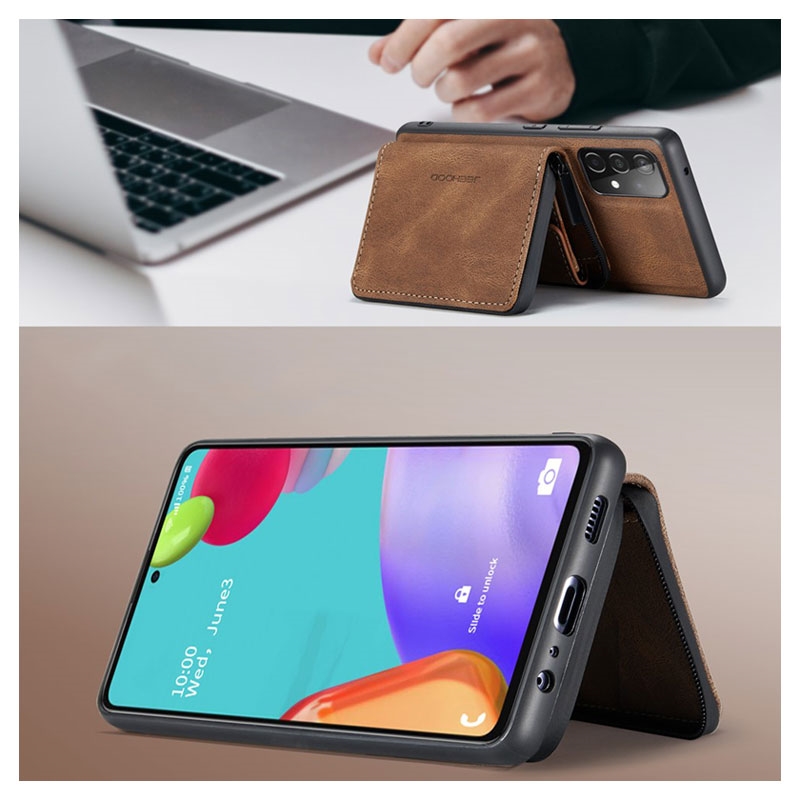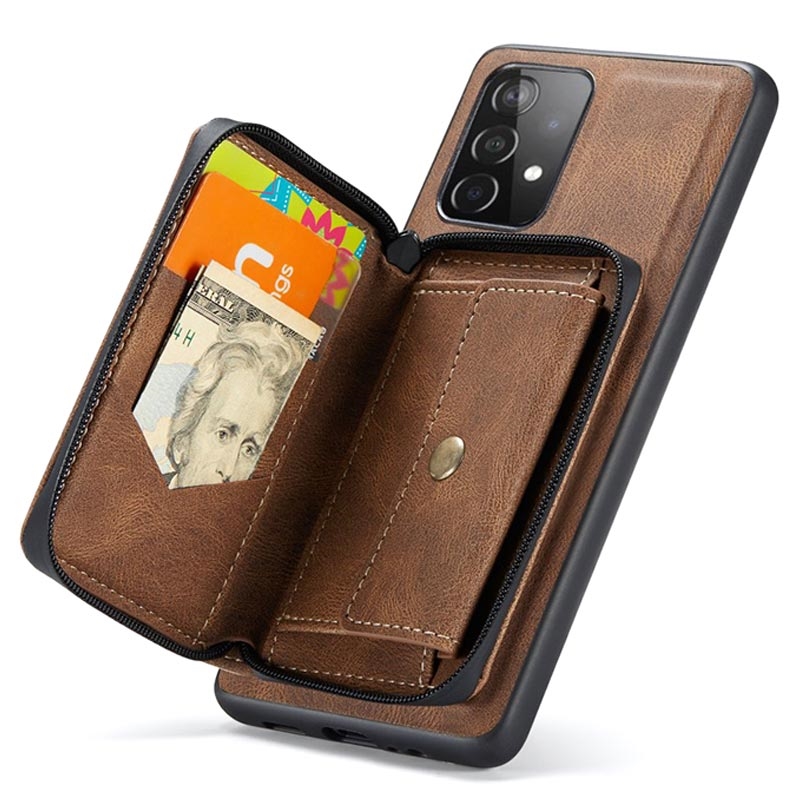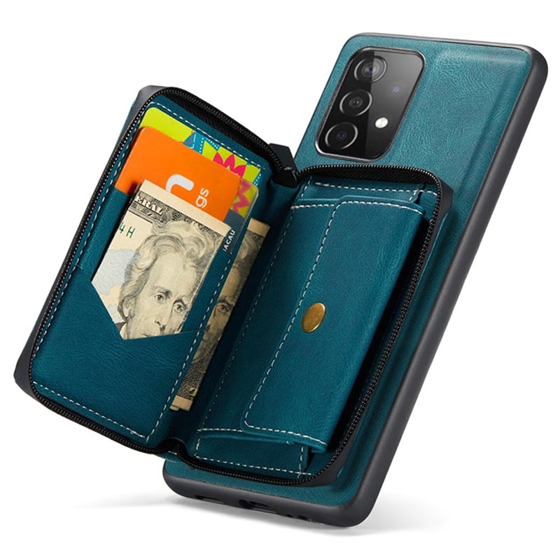 Experimente a combinação perfeita de estilo, conveniência e proteção para Samsung Galaxy A52 5G, Galaxy A52 4G, Galaxy A52s 5G com a capa destacável Jeehood com carteira. Esta elegante capa apresenta um design dois em um com uma carteira destacável, seguramente mantida unida por forte magnetismo. A carteira tem três slots de cartão e dois bolsos de dinheiro equipados com fecho de zíper, mantendo tudo seguro dentro. Feito de uma mistura de TPU e couro PU premium, garante excelente proteção à prova de quedas.
