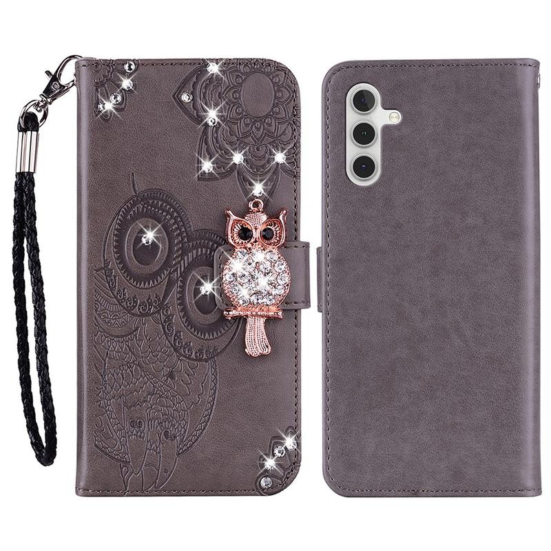 Capa de carteira com strass de coruja para Samsung Galaxy S24 FE - Cinzento