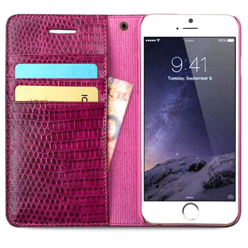 Capa de Pele tipo Carteira da Qialino para iPhone 6 e iPhone 6S - Pele de Crocodilo - Cor-de-Rosa Choque