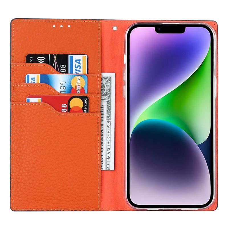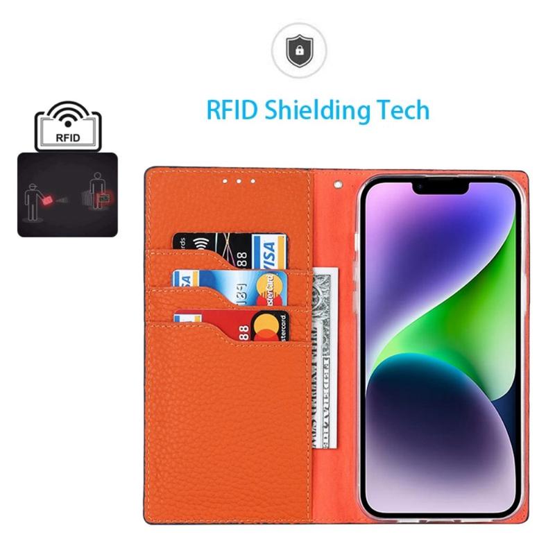Para iPhone 14 RFID Carteira Slot de Cartão de Bloqueio Capa de Telefone Textura Litchi Suporte de Couro Genuíno Capa Protetora Autoabsorvível