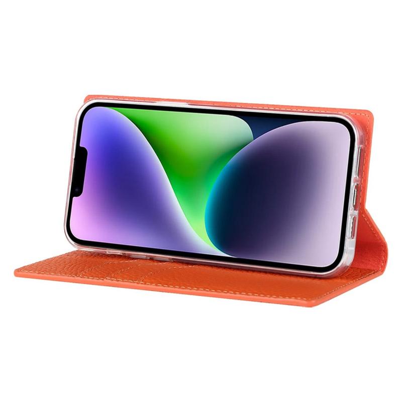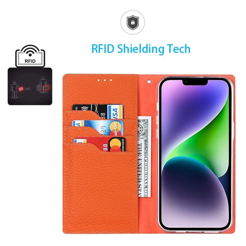 Para iPhone 14 RFID Carteira Slot de Cartão de Bloqueio Capa de Telefone Textura Litchi Suporte de Couro Genuíno Capa Protetora Autoabsorvível