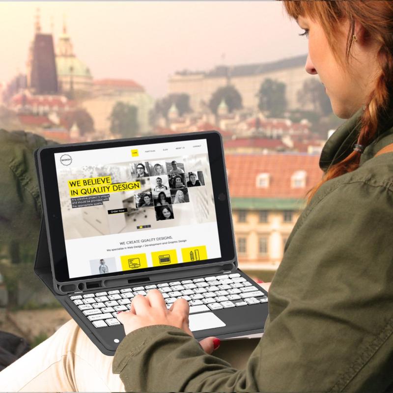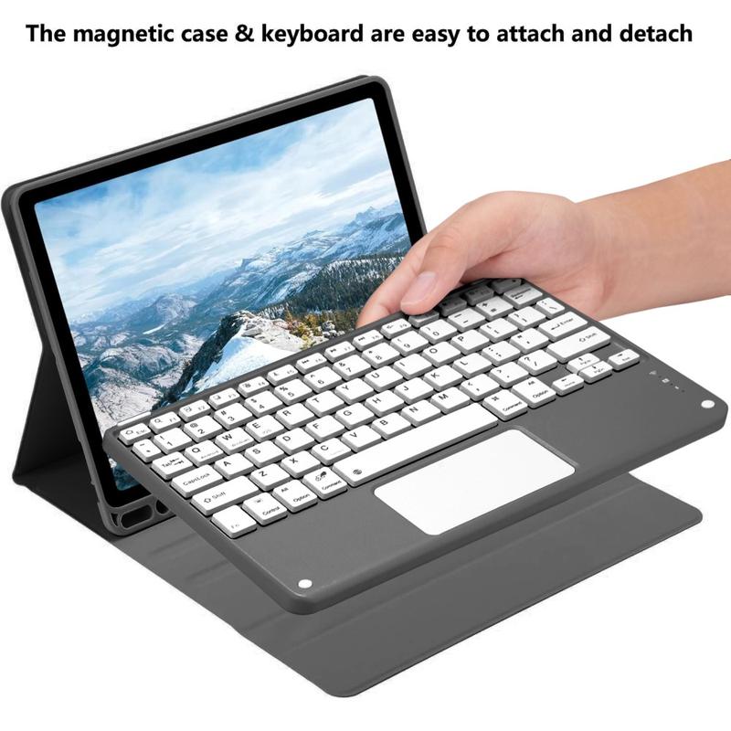 Melhore o seu iPad Air 11 2026/2025/2024, iPad Air 2022/2020 com a capa de teclado Bluetooth, um acessório multifuncional 2 em 1 que combina proteção, produtividade e estilo. Fabricada em poliuretano de alta qualidade, esta capa elegante oferece proteção total contra riscos, choques e impressões digitais, mantendo um aspeto profissional. O teclado Bluetooth liga-se sem fios para uma escrita suave e reactiva, enquanto o touchpad integrado suporta o controlo multi-gesto para uma navegação sem esforço. Com um teclado retroiluminado, pode escrever confortavelmente mesmo em ambientes com pouca luz. O suporte ajustável incorporado oferece um ângulo de visualização ergonómico, tornando-o perfeito para escrever, transmitir ou ler. Concebida para negócios, viagens ou utilização diária, esta capa de teclado transforma o seu tablet numa estação de trabalho portátil.