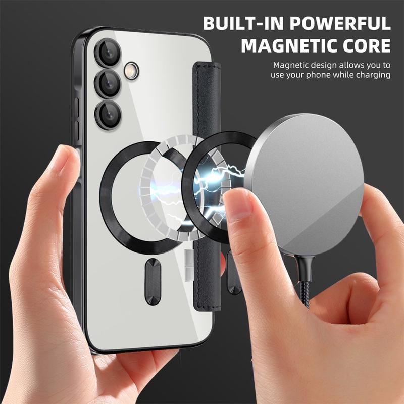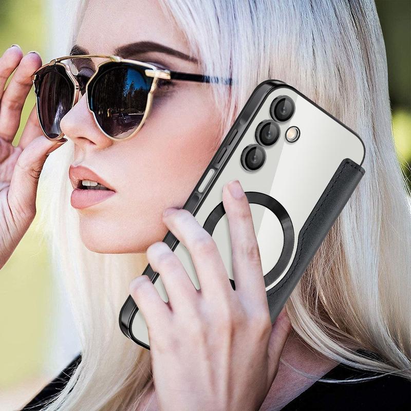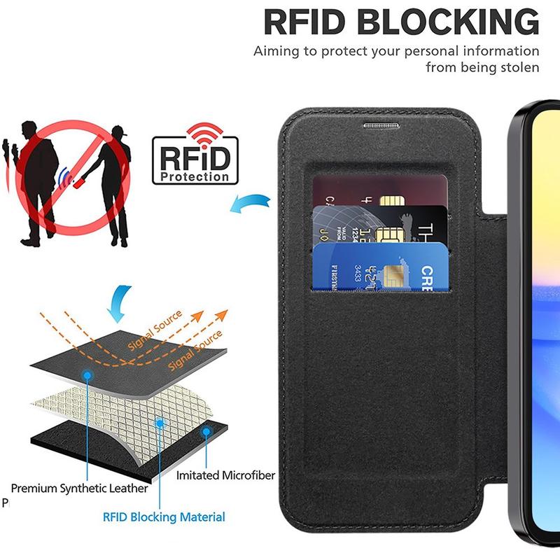 Esta capa premium para o Samsung Galaxy A15 é fabricada com TPU, acrílico e poliuretano de alta qualidade, utilizando um processo fino para garantir um acabamento delicado e requintado. Está equipada com uma prática ranhura para cartões, para facilitar a passagem de cartões e os gastos em viagem, e possui um íman forte para fecho automático, tornando seguro e prático o manuseamento dos itens no interior. Esta capa para o Samsung Galaxy A15 oferece uma proteção eficaz contra o desgaste diário, riscos, marcas e arranhões, enquanto a tecnologia avançada de bloqueio RFID na ranhura para cartões garante que as suas informações pessoais estão protegidas contra roubo. Além disso, o anel magnético incorporado é compatível com o carregamento sem fios MagSafe, o que significa que pode carregar o seu Samsung Galaxy A15 sem retirar a capa.