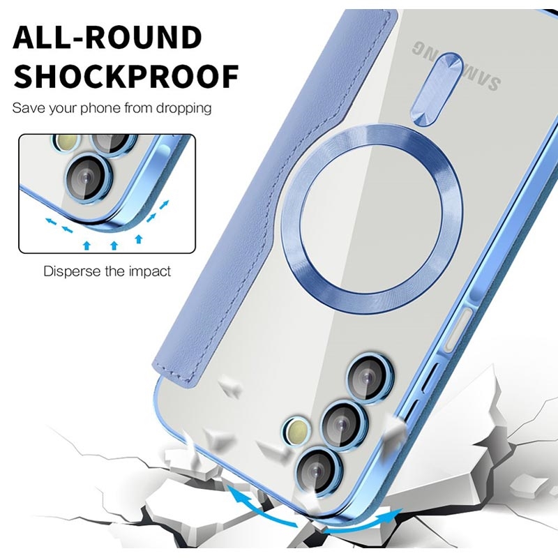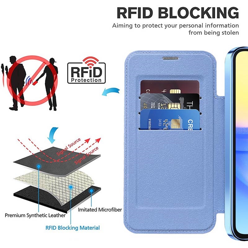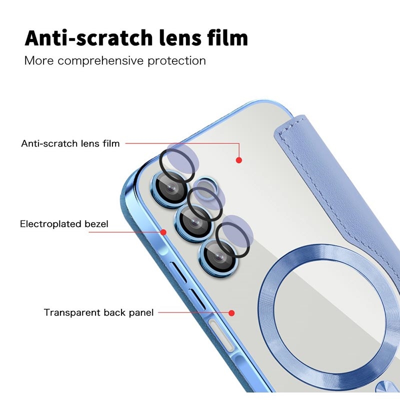 Esta capa premium para o Samsung Galaxy A15 é fabricada com TPU, acrílico e poliuretano de alta qualidade, utilizando um processo fino para garantir um acabamento delicado e requintado. Está equipada com uma prática ranhura para cartões, para facilitar a passagem de cartões e os gastos em viagem, e possui um íman forte para fecho automático, tornando seguro e prático o manuseamento dos itens no interior. Esta capa para o Samsung Galaxy A15 oferece uma proteção eficaz contra o desgaste diário, riscos, marcas e arranhões, enquanto a tecnologia avançada de bloqueio RFID na ranhura para cartões garante que as suas informações pessoais estão protegidas contra roubo. Além disso, o anel magnético incorporado é compatível com o carregamento sem fios MagSafe, o que significa que pode carregar o seu Samsung Galaxy A15 sem retirar a capa.
