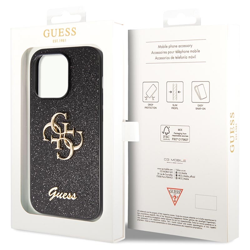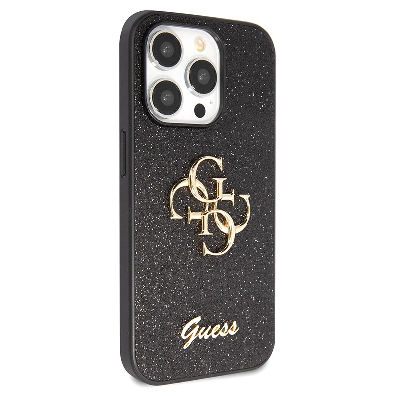 - Espetacular capa com logotipo de metal Guess Fixed Glitter 4G para iPhone 15 Pro Max