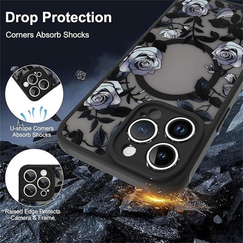 A Capa MagSafe Rose Flower para iPhone 13 Pro oferece uma fusão perfeita de charme vintage e inovação moderna. Com a sua construção híbrida durável, acabamento anti-impressão digital e compatibilidade total com MagSafe, protege o seu telefone, mantendo-o elegante, fino e funcional.