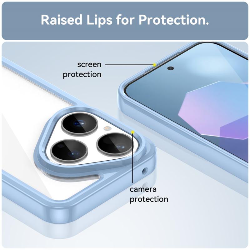 - Construção de material duplo - painel traseiro de acrílico transparente e bordas de TPU