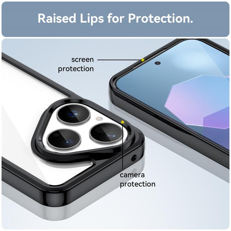 - Construção de material duplo - painel traseiro de acrílico transparente e bordas de TPU