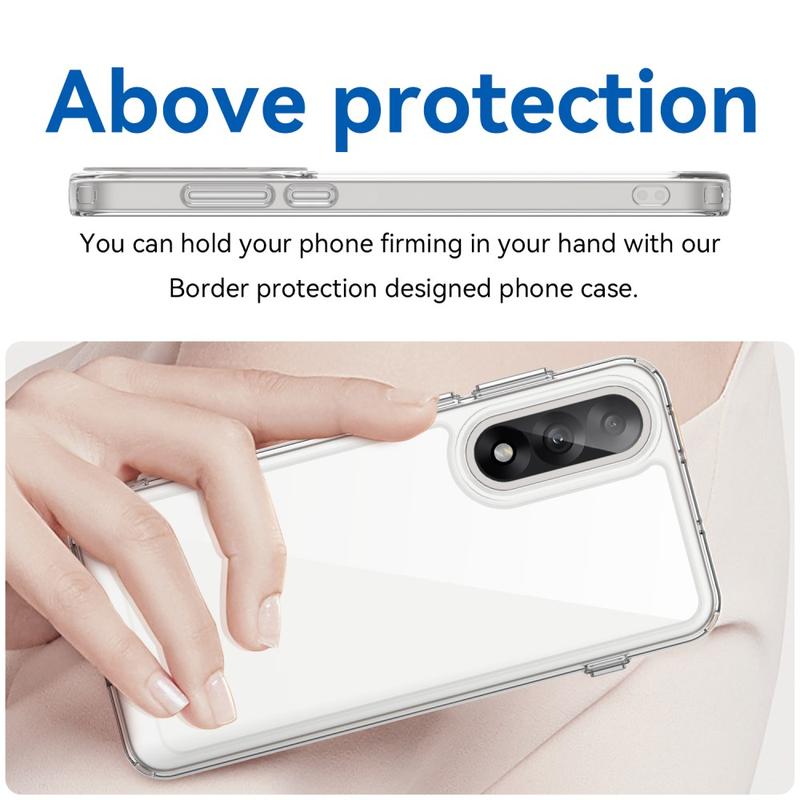 - Construção de material duplo - painel traseiro de acrílico transparente e bordas de TPU