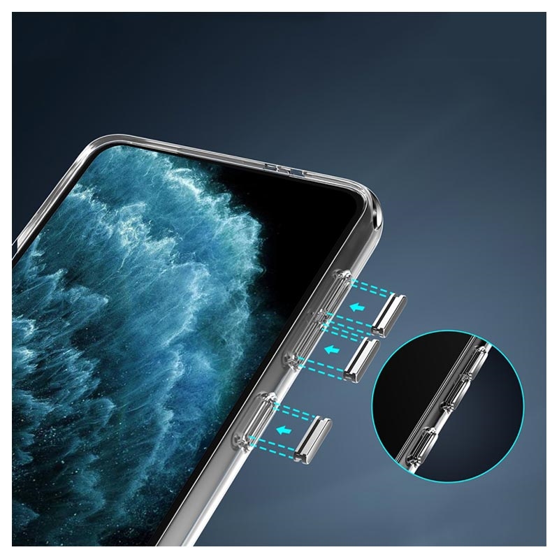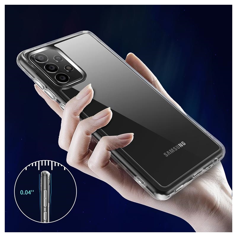 - Construção de material duplo - painel traseiro de acrílico transparente e bordas de TPU