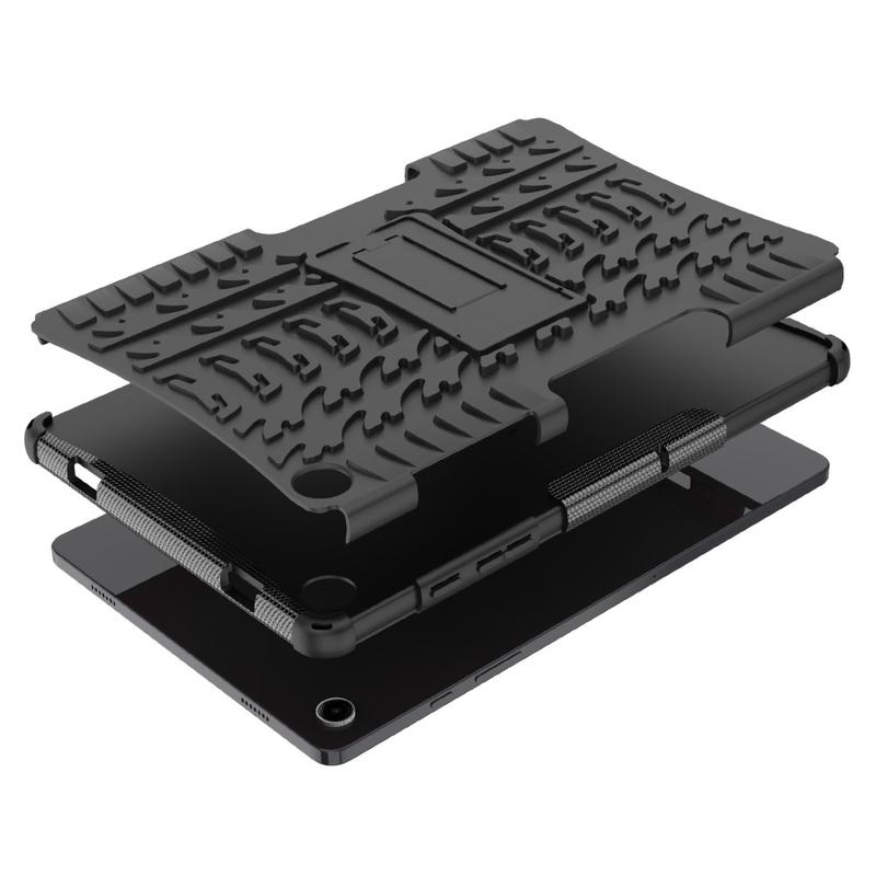 A camada exterior rígida torna o seu Samsung Galaxy Tab A9+ menos suscetível de se dobrar, enquanto que a camada interior amortecedora o protege de quedas e impactos. Além disso, o suporte incorporado permite uma confortável visualização de vídeos no seu Samsung Galaxy Tab A9+.