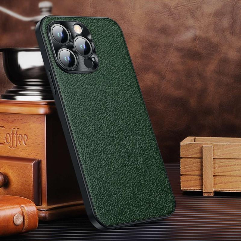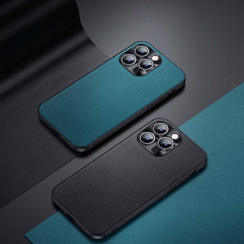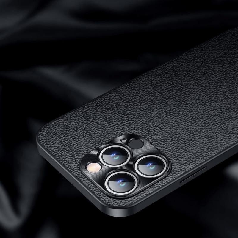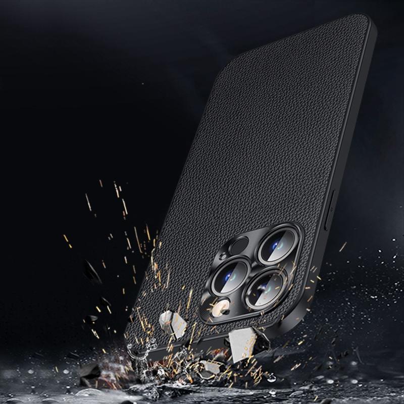 Feito de couro genuíno + material TPU, com uma armação de lente de câmera de metal, mais segura