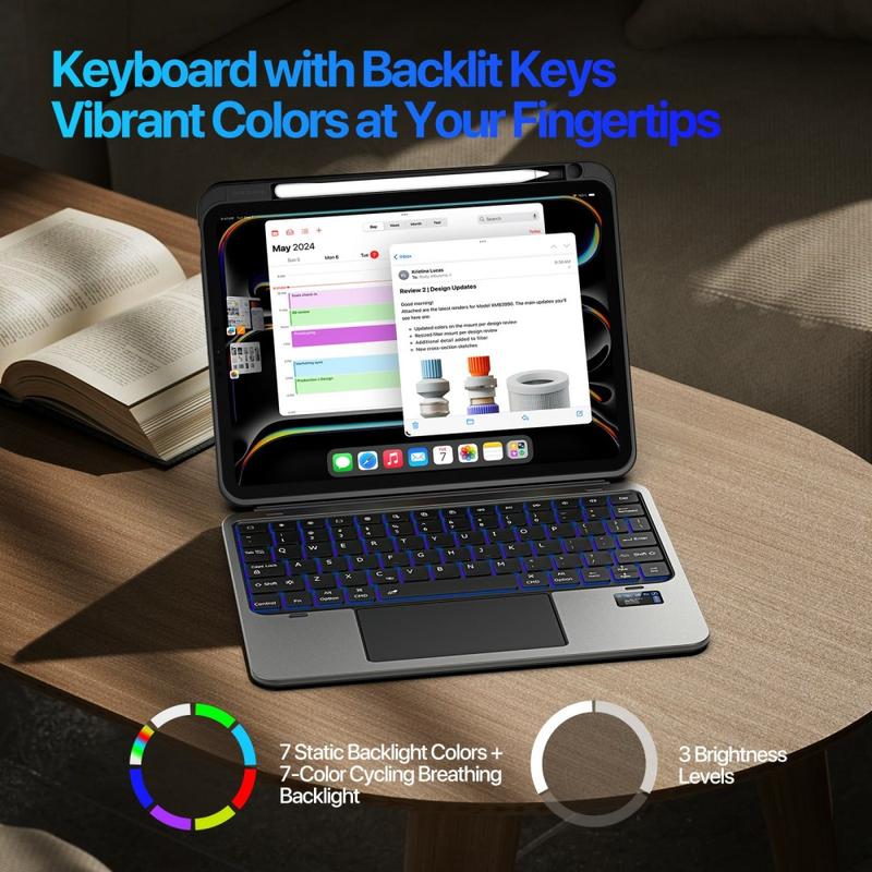 O teclado amovível possui 7 cores de retroiluminação e um efeito de respiração arco-íris, com 3 níveis de brilho ajustáveis. Isto garante uma escrita confortável de dia ou de noite, ao mesmo tempo que acrescenta um toque de estilo.