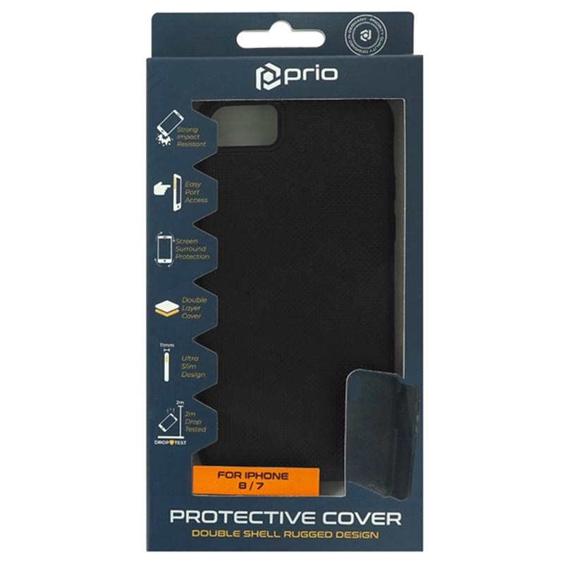 A caixa híbrida Prio Double Shell para iPhone 7, iPhone 8, iPhone SE (2020), iPhone SE (2022) foi testada a uma queda de até 2m, e passou. Embora tenha um design de dupla camada, a caixa Prio Double Shell tem apenas 11mm de espessura quando se insere o iPhone 7, iPhone 8, iPhone SE (2020), iPhone SE (2022).