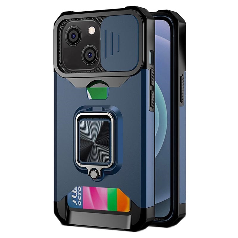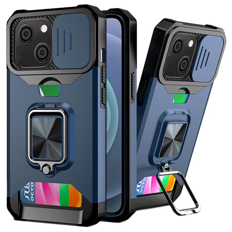 Capa Híbrida Multifuncional 4-em-1 para iPhone 13 com Porta-Cartões, Anel Magnético, Suporte de Apoio, Proteção da Câmara