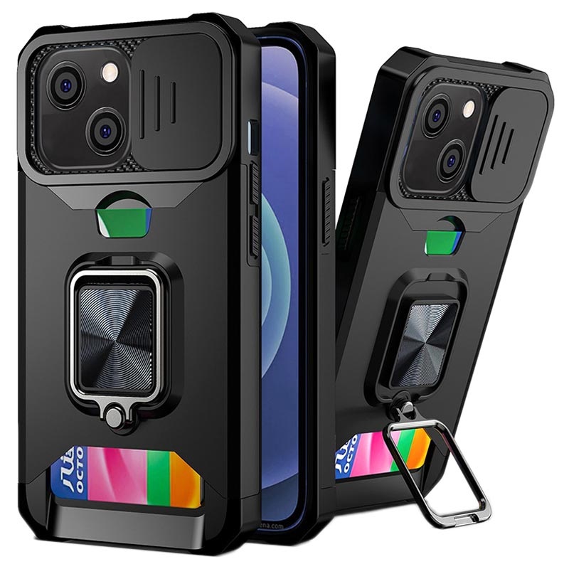 Capa Híbrida Multifuncional 4-em-1 para iPhone 13 com Porta-Cartões, Anel Magnético, Suporte de Apoio, Proteção da Câmara