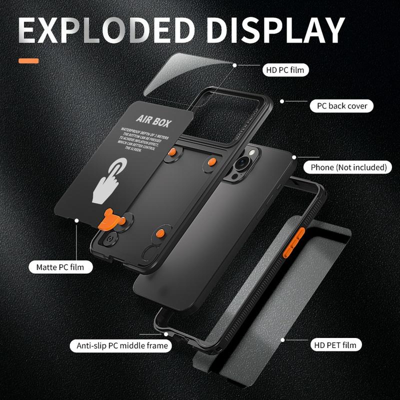 O telefone deve ser montado sem quaisquer acessórios adicionais, tais como protectores de ecrã, decorações ou vidro temperado, fixados ao corpo do telefone (para a instalação do iPhone, lembrete: alinhe o botão de silêncio antes da montagem, o ecrã do produto é resistente a riscos e não há necessidade de protectores de ecrã antes da caixa, uma vez que a aplicação de protectores de ecrã pode afetar o efeito à prova de água).