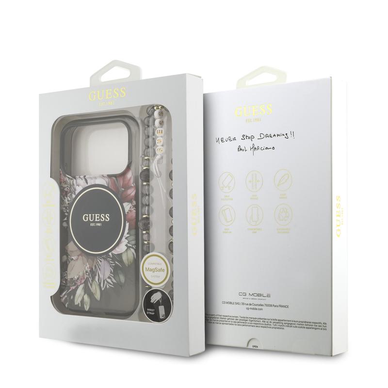 Capa com alça de pérola Guess IML Flowers para iPhone 17 Pro - Capa protetora elegante compatível com MagSafe e pulseira com contas