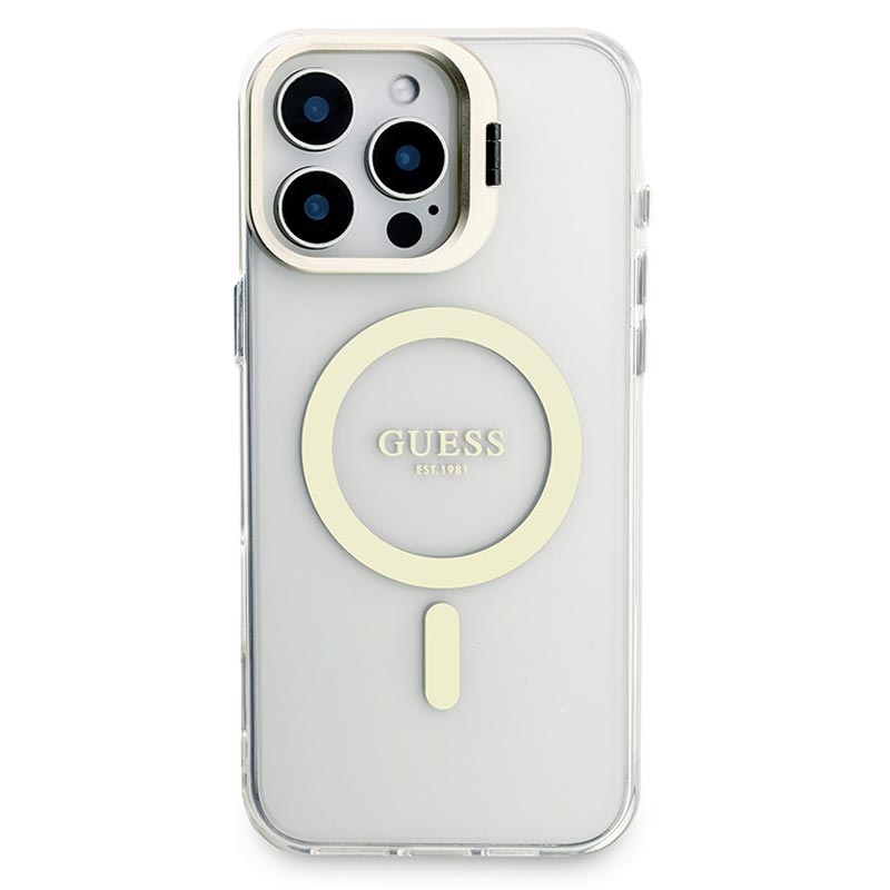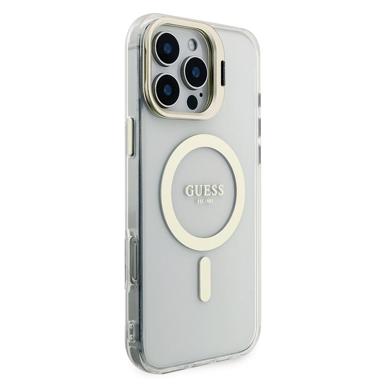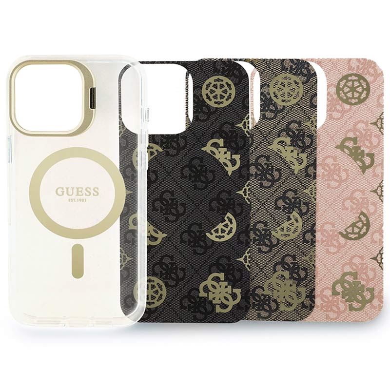 Capa MagSafe com suporte galvanizado e moldura para câmara Guess com fundos intercambiáveis para iPhone 16 Pro Max - Luxo com estilo de troca e proteção diária