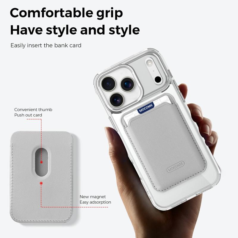 Proteja o seu dispositivo com estilo com a capa MagSafe para iPhone 17 Pro Max, concebida para durabilidade e comodidade. Construída com uma estrutura híbrida de TPU + PC, esta capa combina flexibilidade e resistência para proteger contra quedas, riscos e desgaste diário. O anel magnético integrado torna-a totalmente compatível com o carregamento MagSafe e os suportes magnéticos para automóvel, enquanto a bolsa para cartões fina e amovível com íman duplo permite transportar 1-2 cartões sem aumentar o volume. Um acabamento cristalino mantém o iPhone 17 Pro Max com um aspeto elegante e original, enquanto as extremidades reforçadas e os rebordos elevados garantem uma proteção total do ecrã e da câmara.