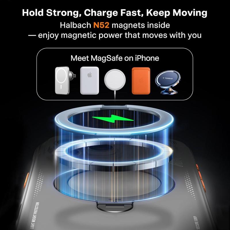 Com a tecnologia Halbach Array e ímanes de neodímio N52SH de qualidade superior, o estojo proporciona uma força magnética até 200% mais forte. Isto garante uma fixação e carregamento fiáveis com todos os acessórios MagSafe.