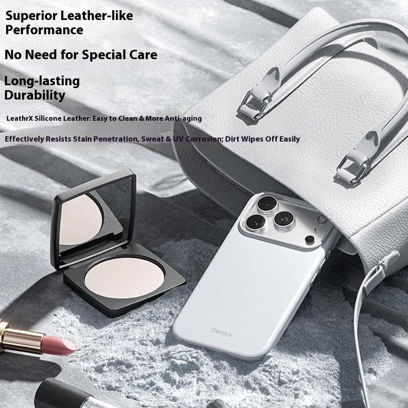 Proteja o seu telemóvel com estilo com a capa MagSafe BENKS Q2 para iPhone 17 Pro Max. Especialmente concebida com um exterior em pele de microfibra, uma estrutura rígida em PC e um interior em silicone macio, proporciona uma sensação de luxo ao mesmo tempo que oferece proteção para todo o corpo. A inovadora matriz magnética de terras raras N52 melhora a compatibilidade MagSafe, garantindo uma ligação forte e fiável para carregadores e acessórios. Concebida para resistir às impressões digitais e ao suor, esta capa mantém-se limpa e elegante durante a utilização diária. Com o seu perfil fino, ajuste preciso e textura de aderência melhorada, a BENKS Q2 equilibra na perfeição a sofisticação, o conforto e a durabilidade.