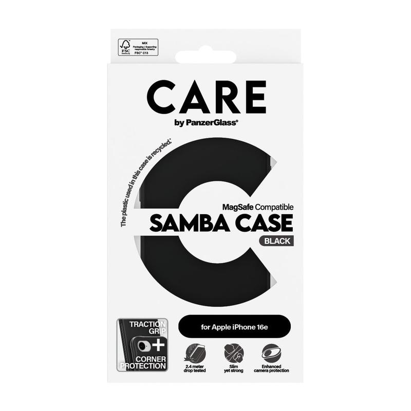 Proteja o seu iPhone 16e com estilo, sustentabilidade e conforto com a Capa CARE by PanzerGlass Fashionable em Samba Black - onde a proteção tecnológica se alia ao design moderno!
